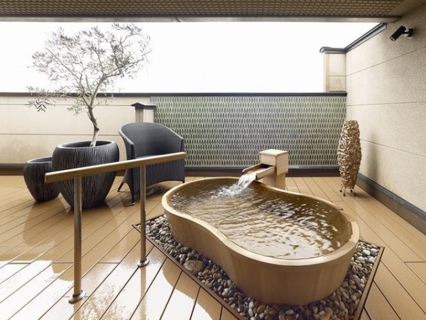 当館より架かる赤い桟橋を渡ると、全国でも他に例のない湖上露天風呂がございます。